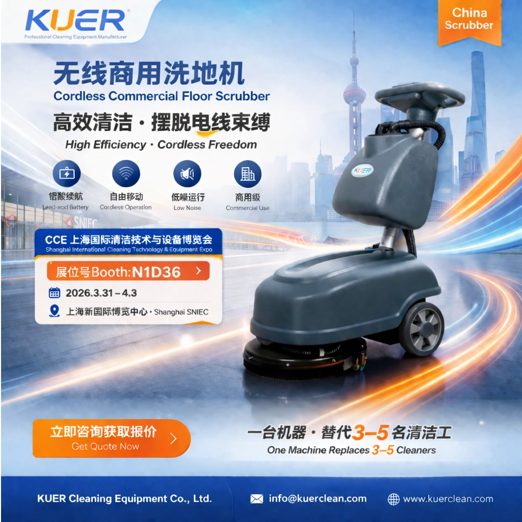 As a professional China-based manufacturer, KUER Cleaning Equipment Co., Ltd. will showcase its latest cordless commercial floor scrubber at the upcoming CCE Shanghai International Cleaning Technology and Equipment Expo.